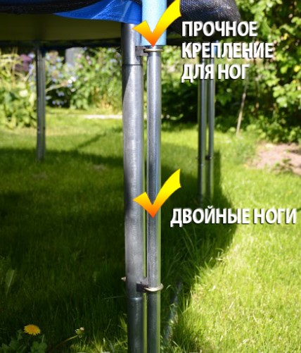 Металлические части (каркас батута, опоры и прочее) изготовлены из стали и оцинкованы изнутри и снаружи, что защищает от воздействий внешней среды и препятствует образованию коррозии.