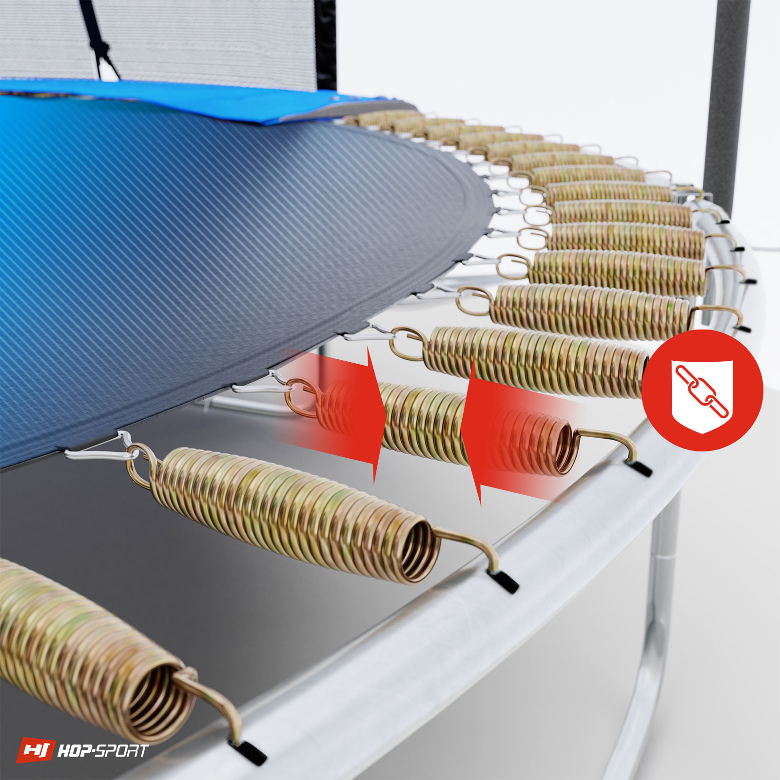 Пружины присоединяются к полотну при помощи треугольных карабинов на петле, каждая из которых прострочена 8-ю плотными фабричными швами, что полностью защищает от разрывов в местах крепления пружин.
