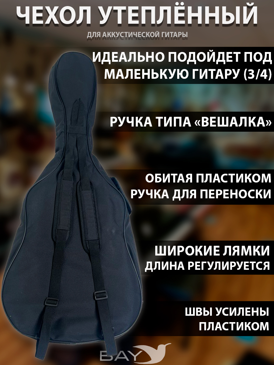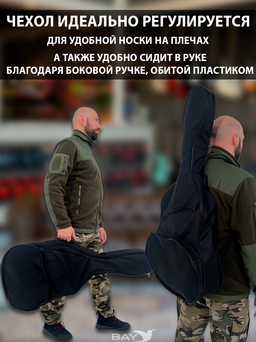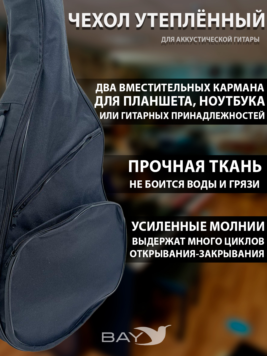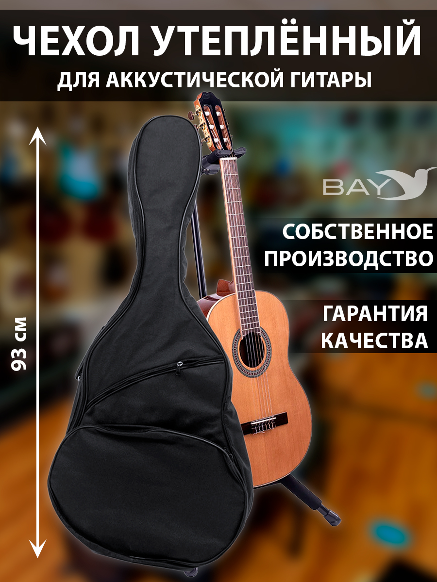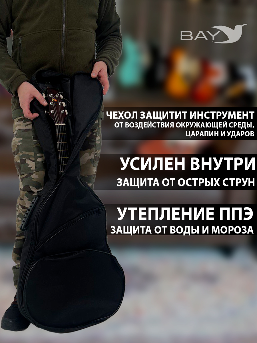 Чехол кофр для акустической гитары для транспортировки. Чехол кофр сумка рюкзак профессиональный полужесткий для бас-гитары, электрогитары, соло-гитары, высотой 93 см. Чехол имеет уплотнение толщиной в 10 мм. из пенистого материала и покрыт высококачественным полиэстером, что позволяет защитить инструмент от неблагоприятных внешних воздействий. Внутреннее отделение чехла покрыто очень мягкой тканью, полностью безопасным для косметического состояния инструмента. Уплотнитель (вспененный полиэтилен) можно считать утеплителем, но в данном случае основная функция уплотнителя - защита инструмента от механических повреждений. Для хранения пера грифа и бриджа присутствуют дополнительные вставки из полиэстера. В чехле предусмотрены большие карманы для аксессуаров, куда вы можете положить нотную тетрадь, тюнер и другие необходимые вам принадлежности. Для транспортировки предусмотрены, удобная ручка и широкие мягкие лямки. В чехле использованы качественные застежки и замки. Получите удовольствие от использования чехла BAY для вашего инструмента. Позаботьтесь о сохранности вашего лучшего друга. Отличный подарок сыну, мужу, брату, соратнику.