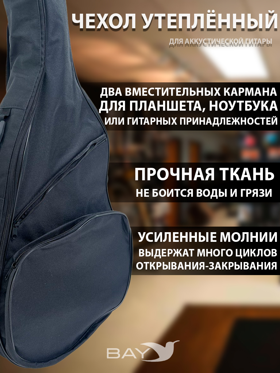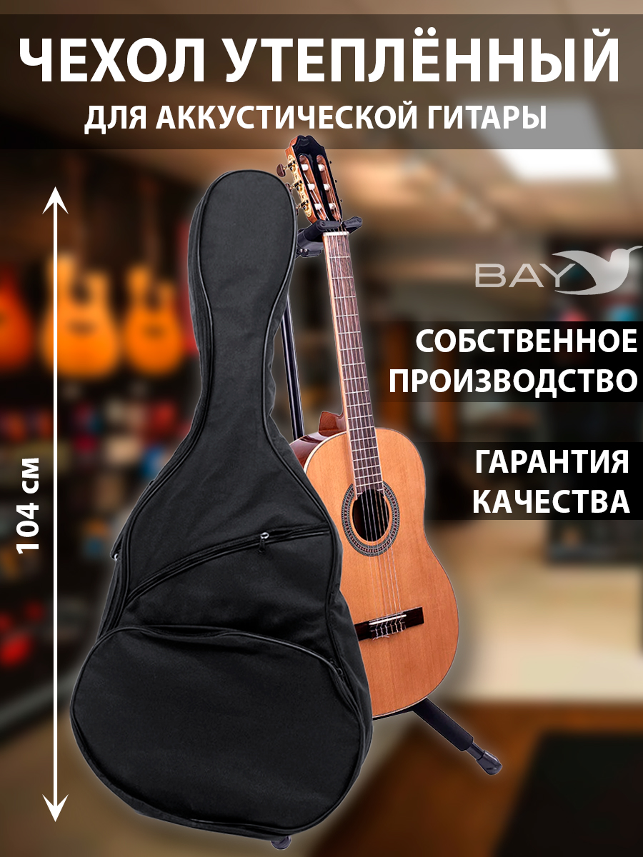 Чехол кофр для акустической гитары для транспортировки. Чехол кофр сумка рюкзак профессиональный полужесткий для бас-гитары, электрогитары, соло-гитары, высотой 104 см. Чехол имеет уплотнение толщиной в 10 мм. из пенистого материала и покрыт высококачественным полиэстером, что позволяет защитить инструмент от неблагоприятных внешних воздействий. Внутреннее отделение чехла покрыто очень мягкой тканью, полностью безопасным для косметического состояния инструмента. Уплотнитель (вспененный полиэтилен) можно считать утеплителем, но в данном случае основная функция уплотнителя - защита инструмента от механических повреждений. Для хранения пера грифа и бриджа присутствуют дополнительные вставки из полиэстера. В чехле предусмотрены большие карманы для аксессуаров, куда вы можете положить нотную тетрадь, тюнер и другие необходимые вам принадлежности. Для транспортировки предусмотрены, удобная ручка и широкие мягкие лямки. В чехле использованы качественные застежки и замки. Получите удовольствие от использования чехла BAY для вашего инструмента. Позаботьтесь о сохранности вашего лучшего друга. Отличный подарок сыну, мужу, брату, соратнику.