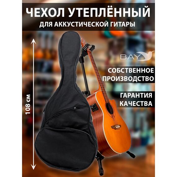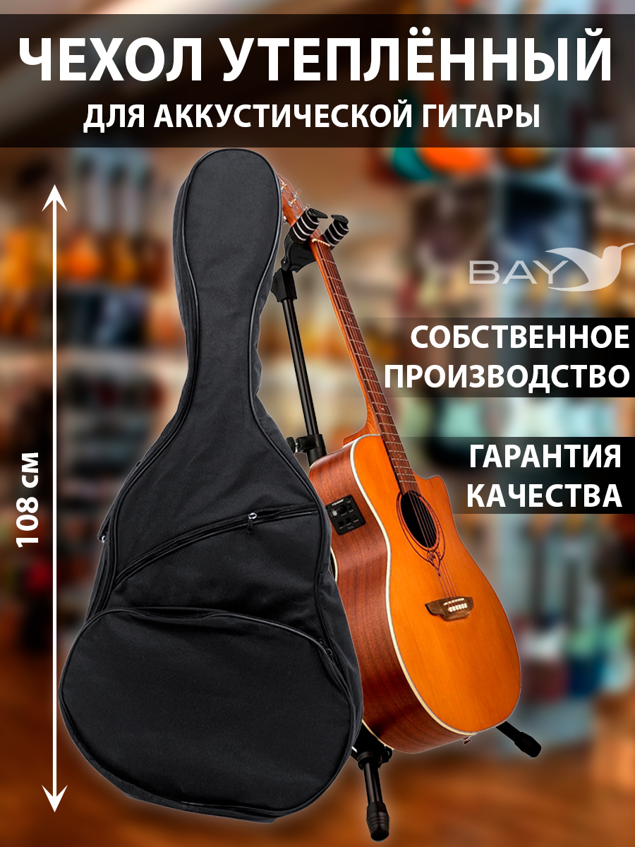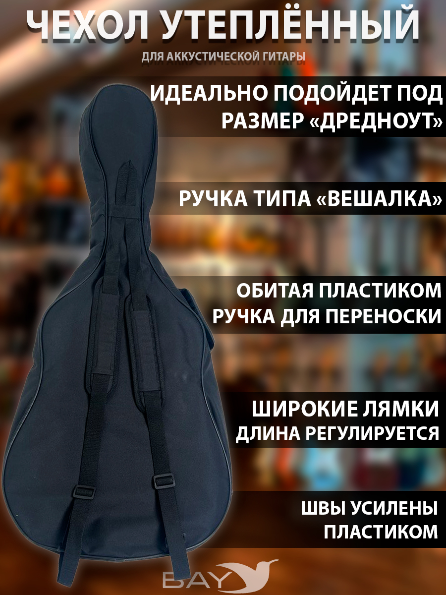 Чехол кофр для акустической гитары для транспортировки. Чехол кофр сумка рюкзак профессиональный полужесткий для бас-гитары, электрогитары, соло-гитары, высотой 93 см. Чехол имеет уплотнение толщиной в 10 мм. из пенистого материала и покрыт высококачественным полиэстером, что позволяет защитить инструмент от неблагоприятных внешних воздействий. Внутреннее отделение чехла покрыто очень мягкой тканью, полностью безопасным для косметического состояния инструмента. Уплотнитель (вспененный полиэтилен) можно считать утеплителем, но в данном случае основная функция уплотнителя - защита инструмента от механических повреждений. Для хранения пера грифа и бриджа присутствуют дополнительные вставки из полиэстера. В чехле предусмотрены большие карманы для аксессуаров, куда вы можете положить нотную тетрадь, тюнер и другие необходимые вам принадлежности. Для транспортировки предусмотрены, удобная ручка и широкие мягкие лямки. В чехле использованы качественные застежки и замки. Получите удовольствие от использования чехла BAY для вашего инструмента. Позаботьтесь о сохранности вашего лучшего друга. Отличный подарок сыну, мужу, брату, соратнику.