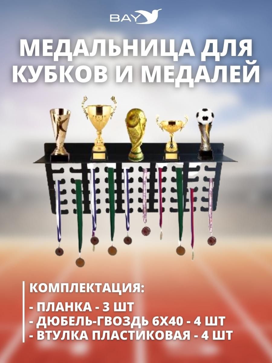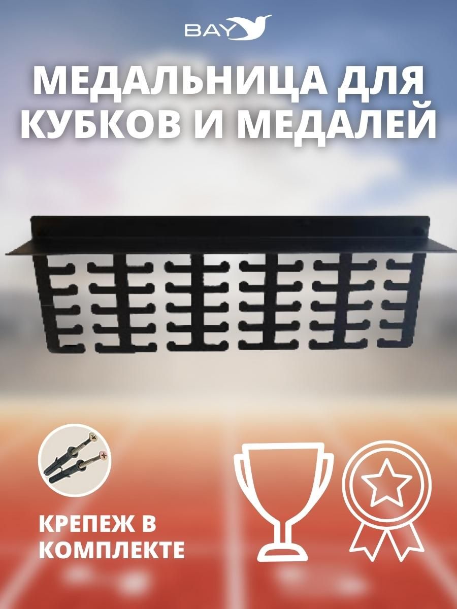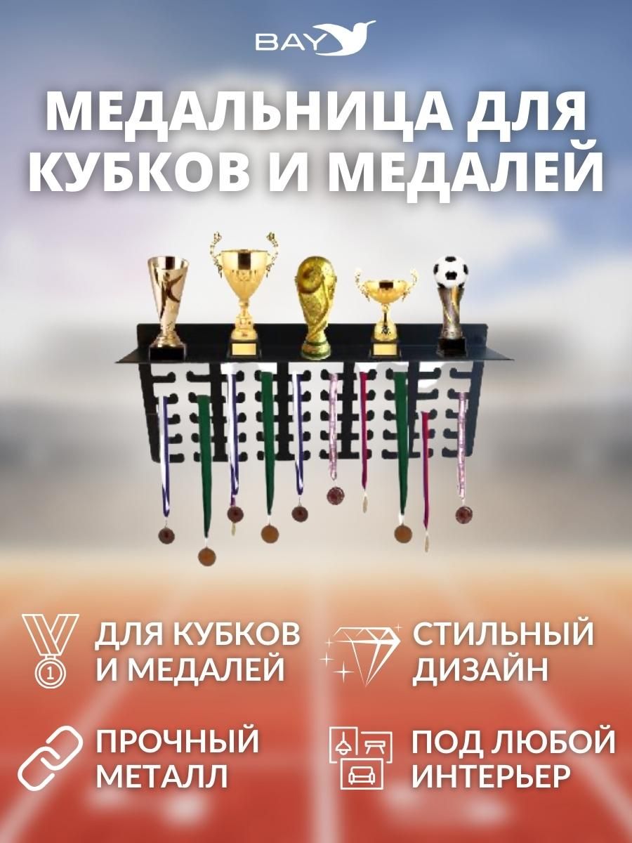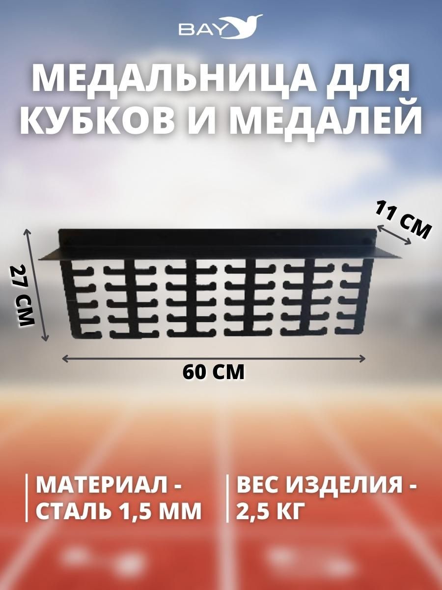 Одна из самых привлекательных особенностей этой медальницы - это полка для кубков. Теперь у вас есть возможность выставить все самые ценные награды на виду. Каждый раз, проходя мимо этой полки, вы будете вспоминать свои соревнования и чувствовать гордость за свои достижения. Эта большая медальница оснащена вешалкой для медалей. Все ваши медали будут аккуратно висеть на этой стильной полочке, создавая удивительный визуальный эффект. Металлическая полка для кубков изготовлена из прочной стали толщиной 1,5 мм, что гарантирует ее долговечность. Держатель для наград отлично впишется в любой интерьер и станет прекрасным дополнением в доме, а коллекция побед будет мотивировать вас или вашего ребёнка для дальнейшего достижения невероятных высот в спортивной карьере.