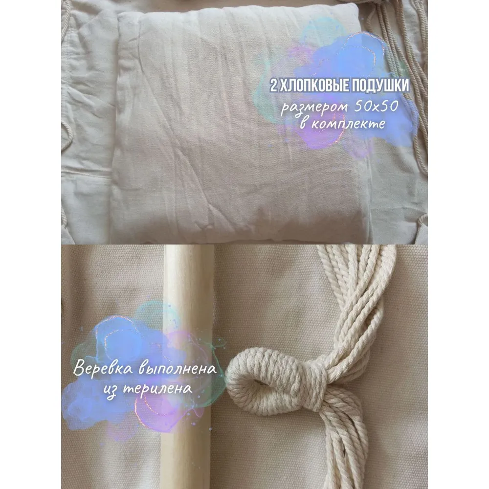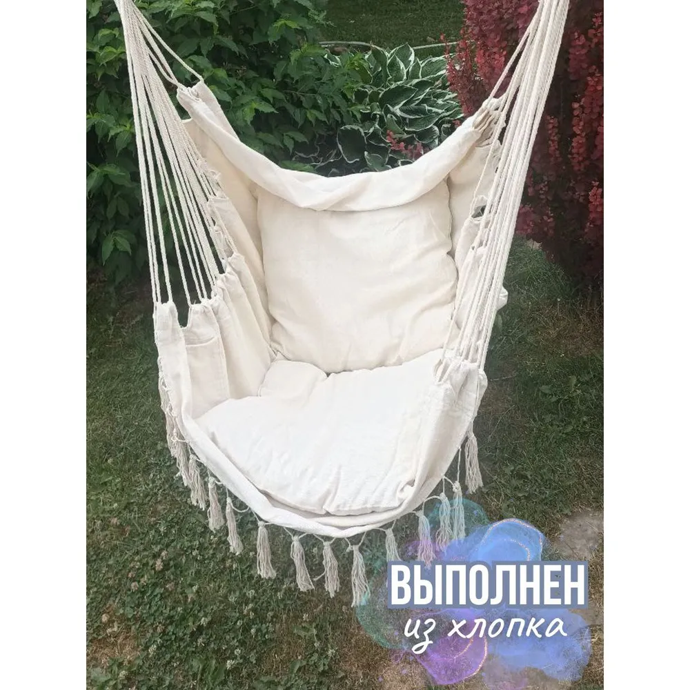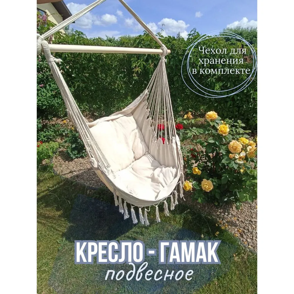 Подвесной гамак WAHOO – это про удобство и комфорт. Отличное приобретение для дачи в летний период и для дома в любой сезон. В одноместном кресле – гамаке вы почувствуете расслабление и уют, ведь сделан он из хлопка, что очень комфортно в жаркую погоду. Гамак универсален, можно использовать как качели и как кресло для спокойного отдыха и сна на свежем воздухе. В комплекте идут две мягкие подушки 50х50 , которые придадут вашему отдыху еще больше удовольствия. Удобно и то, что гамак переносной и его параметры 100х150 см, что позволит легко собрать и перевесить в нужное место, а так же взять его с собой в лес, на пикник, в поход или на пляж. Крепления данного изделия надежды и имеют схожесть с универсальными подвесными качелями. В комплекте так же вы найдете компактный чехол, куда можно убрать гамак после сборки. Длина деревянной палки, на которую за счет териленовой веревки крепится само кресло, составляет 98 см. Помимо удобства и комфорта, гамак является красивым и стильным аксессуаром. За счет приятного бежевого цвета , он впишется в любой интерьер и прекрасно будет выглядеть на даче, на балконе, в спальне или в детской комнате. Гамак wahoo – это про отдых для детей и взрослых.