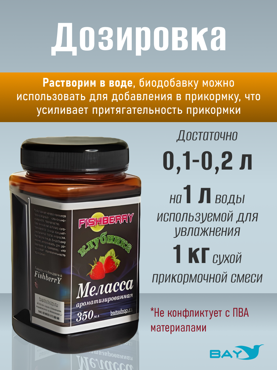 Рыболовная меласса является производным свекольно-сахарного производства. Ароматическая добавка изготавливается в виде концентрированной густой жидкости. Растворим в воде, биодобавку можно использовать для добавления в прикормку, что усиливает притягательность прикормки.