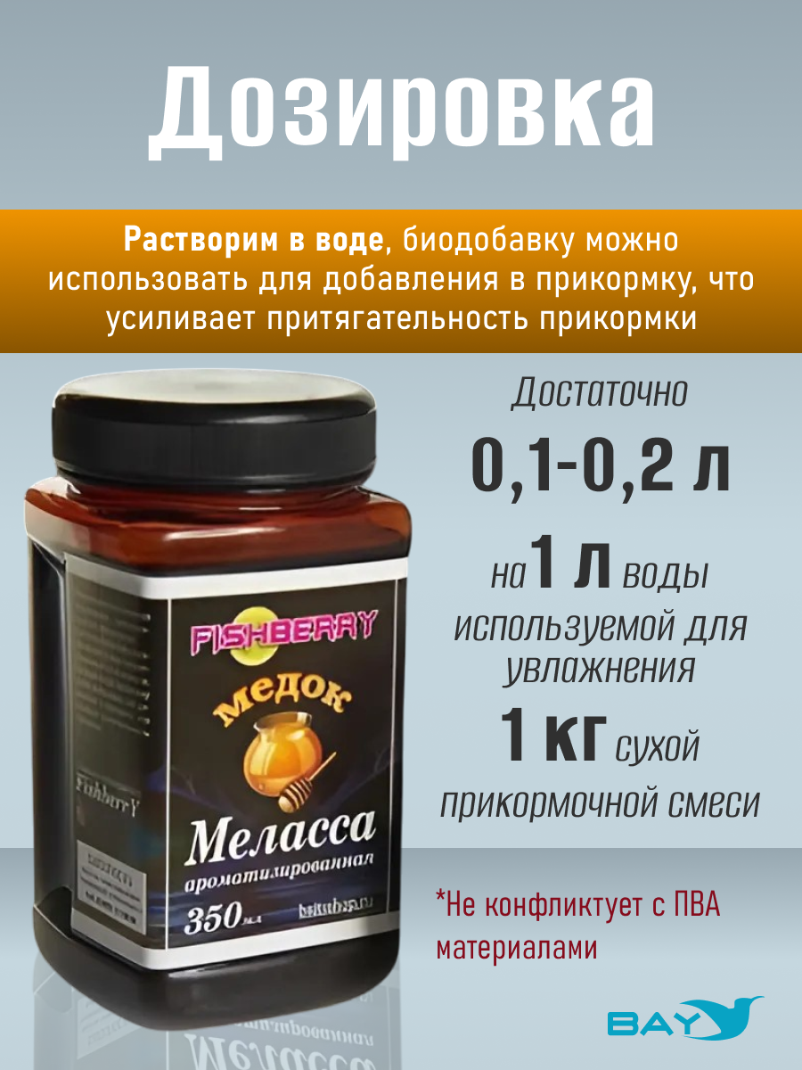 Рыболовная меласса является производным свекольно-сахарного производства. Ароматическая добавка изготавливается в виде концентрированной густой жидкости. Растворим в воде, биодобавку можно использовать для добавления в прикормку, что усиливает притягательность прикормки.