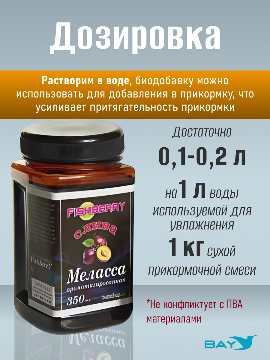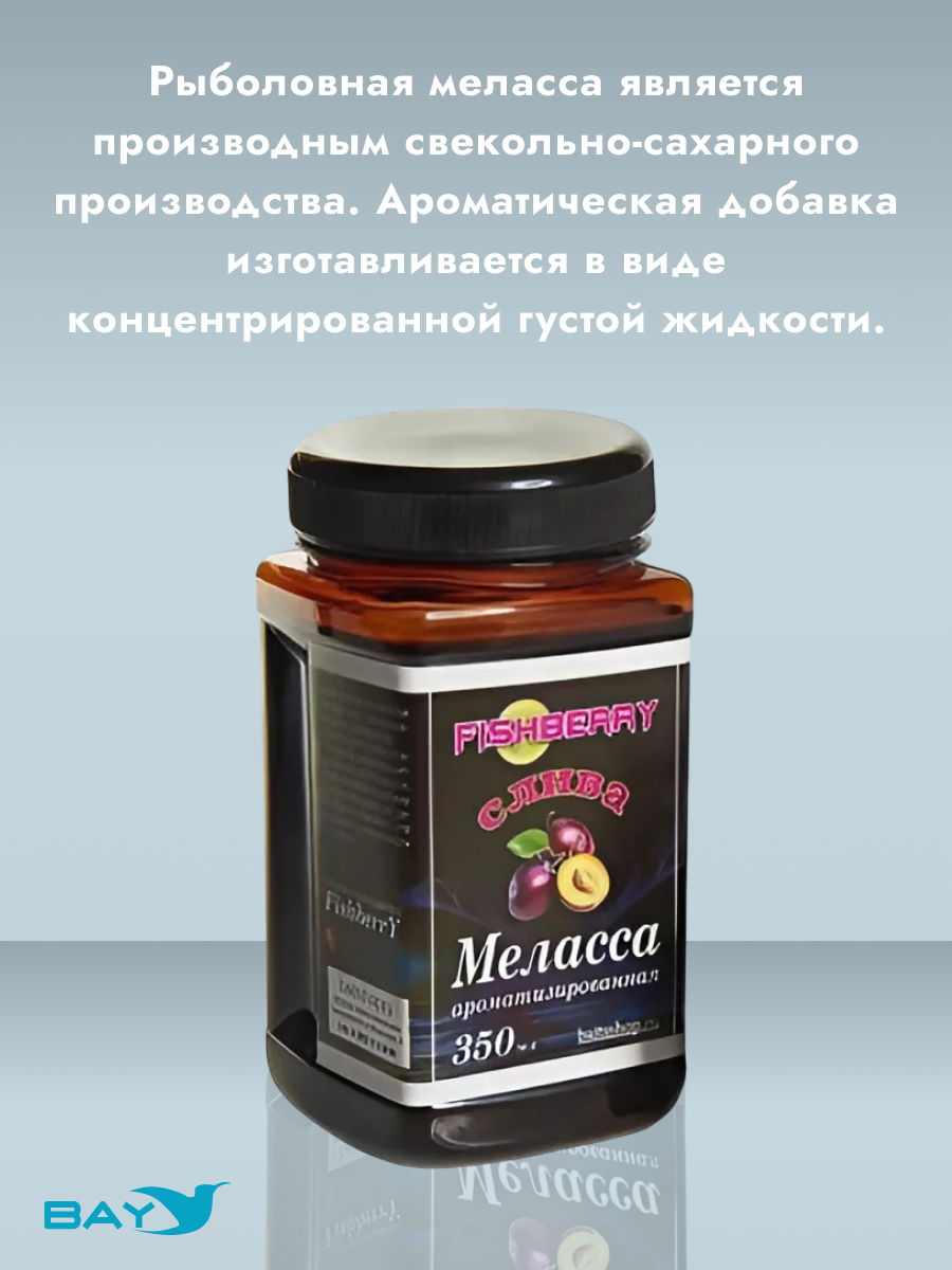 Рыболовная меласса является производным свекольно-сахарного производства. Ароматическая добавка изготавливается в виде концентрированной густой жидкости. Растворим в воде, биодобавку можно использовать для добавления в прикормку, что усиливает притягательность прикормки.