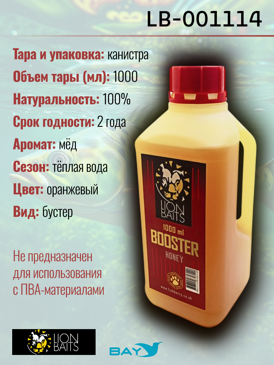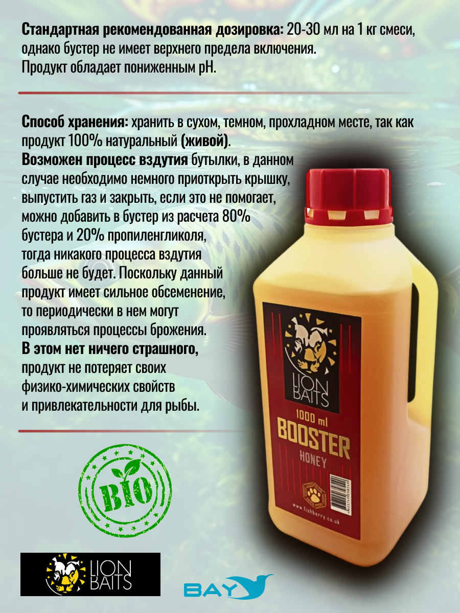 Серия бустеров LION BAITS разработана и предназначена для быстрого привлечения рыбы в зону ловли. Бустеры изготовлены на основе кукурузной патоки, с добавлением аминокислотных компонентов, натуральной вытяжки, гелеобразователя, эмульгаторов и вкусовых ароматизаторов. По консистенции состав бустера однородный, имеет слегка тягучие свойства. Возможно, использовать как с сыпучими прикормками, смешивая бустер с водой, так и в качестве самостоятельного компонента для заливки смеси зерновых, пеллетса, бойлов и пр. Бустер не предназначен для использования с ПВА материалами. Не имеет предельного порога включения . Рекомендованная дозировка: 50-100 мл на 1 кг смеси.