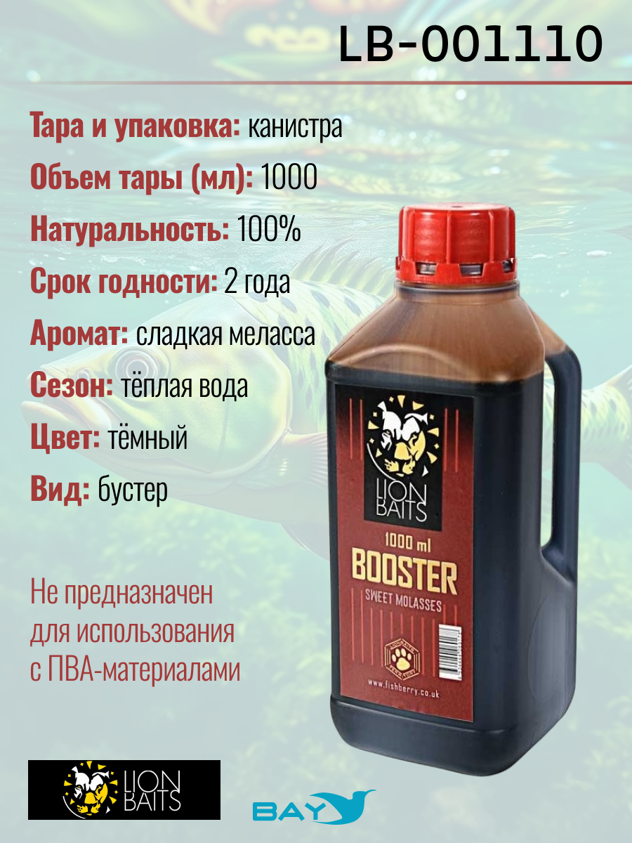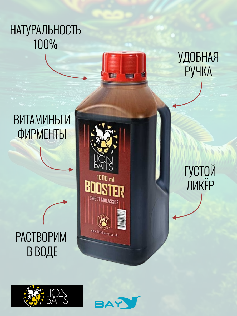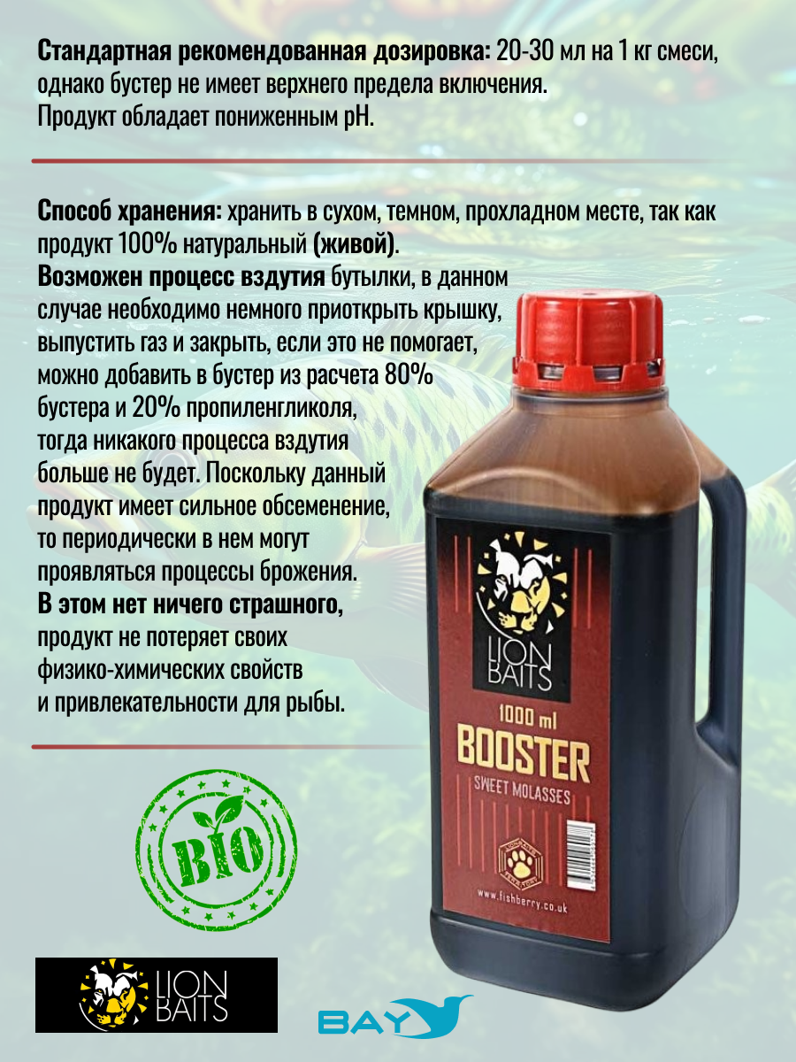 Серия бустеров LION BAITS разработана и предназначена для быстрого привлечения рыбы в зону ловли. Бустеры изготовлены на основе кукурузной патоки, с добавлением аминокислотных компонентов, натуральной вытяжки, гелеобразователя, эмульгаторов и вкусовых ароматизаторов. По консистенции состав бустера однородный, имеет слегка тягучие свойства. Возможно, использовать как с сыпучими прикормками, смешивая бустер с водой, так и в качестве самостоятельного компонента для заливки смеси зерновых, пеллетса, бойлов и пр. Бустер не предназначен для использования с ПВА материалами. Не имеет предельного порога включения . Рекомендованная дозировка: 50-100 мл на 1 кг смеси.