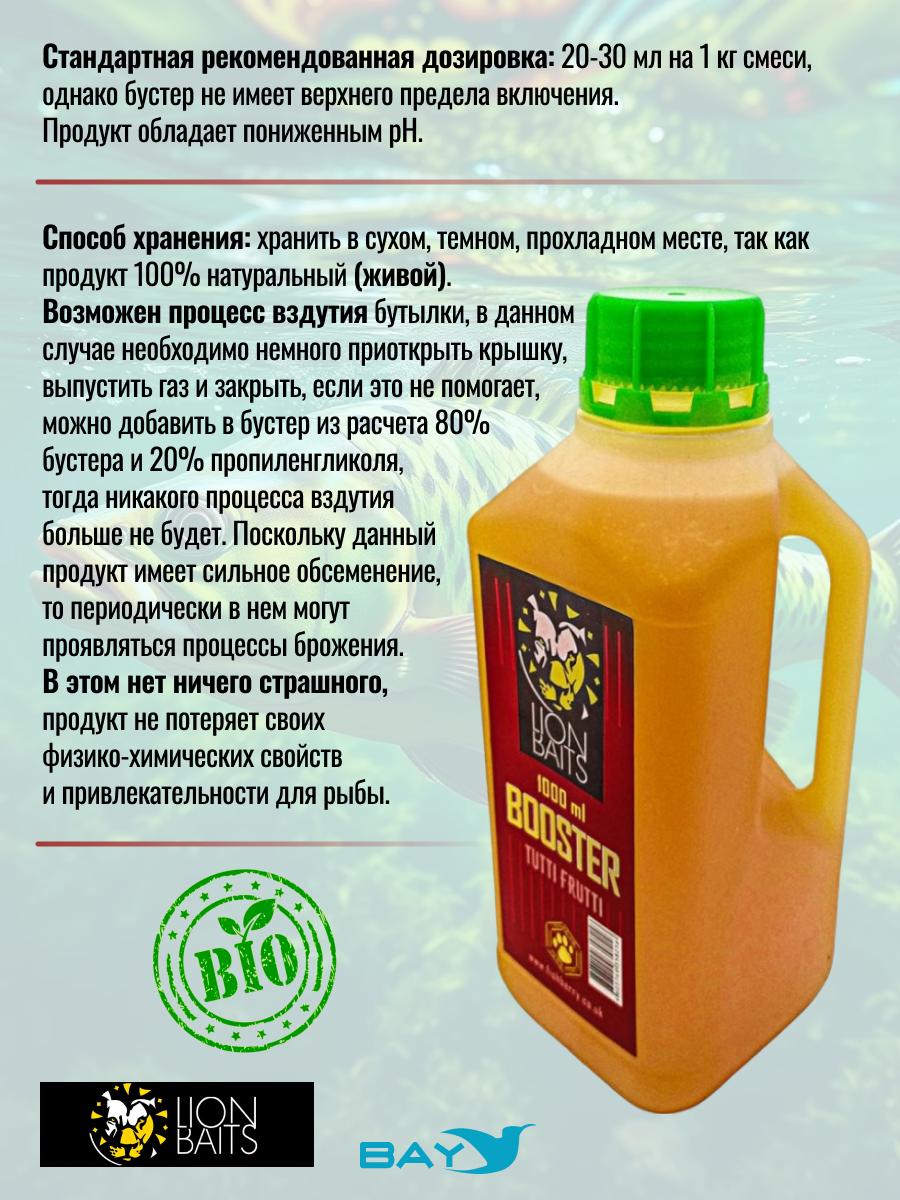 Серия бустеров LION BAITS разработана и предназначена для быстрого привлечения рыбы в зону ловли. Бустеры изготовлены на основе кукурузной патоки, с добавлением аминокислотных компонентов, натуральной вытяжки, гелеобразователя, эмульгаторов и вкусовых ароматизаторов. По консистенции состав бустера однородный, имеет слегка тягучие свойства. Возможно, использовать как с сыпучими прикормками, смешивая бустер с водой, так и в качестве самостоятельного компонента для заливки смеси зерновых, пеллетса, бойлов и пр. Бустер не предназначен для использования с ПВА материалами. Не имеет предельного порога включения . Рекомендованная дозировка: 50-100 мл на 1 кг смеси.