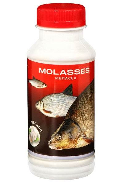 Меласса с ароматом чеснока. Перед применением продукт следует развести в воде для замеса прикормки. Один флакон содержит 250 г мелассы и рассчитан на 3-5 кг прикормки.