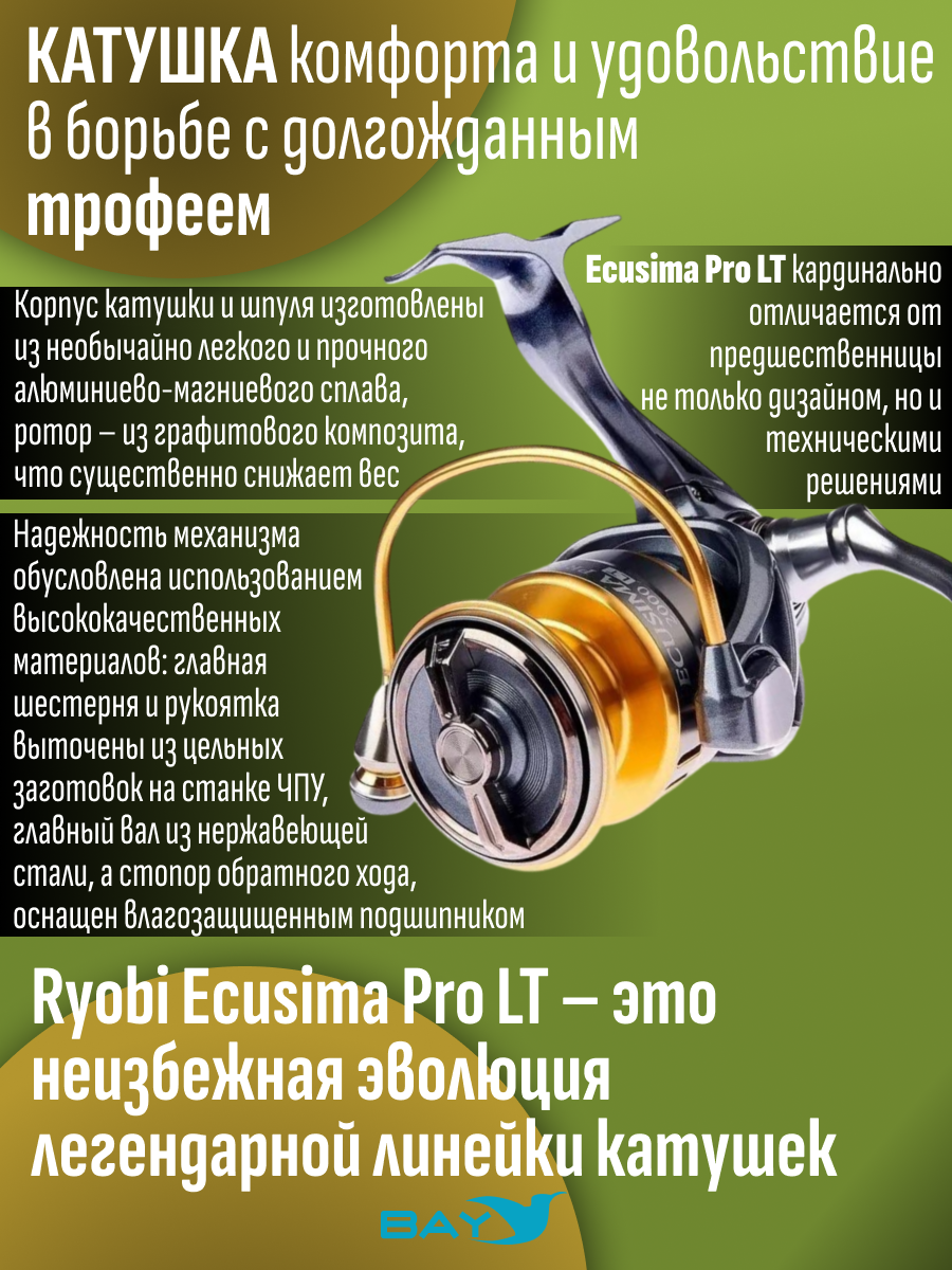 Ryobi Ecusima Pro LT – это неизбежная эволюция легендарной линейки катушек. Модификация Pro LT кардинально отличается от предшественницы не только дизайном, но и техническими решениями. Корпус катушки и шпуля изготовлены из необычайно легкого и прочного алюминиево-магниевого сплава, ротор – из графитового композита, что существенно снижает вес. Надежность механизма обусловлена использованием высококачественных материалов: главная шестерня и рукоятка выточены из цельных заготовок на станке ЧПУ, главный вал из нержавеющей стали, а стопор обратного хода, оснащен влагозащищенным подшипником. Многодисковый фрикционный тормоз и кноб с нескользящим покрытием добавят комфорта и удовольствия в борьбе с долгожданным трофеем.