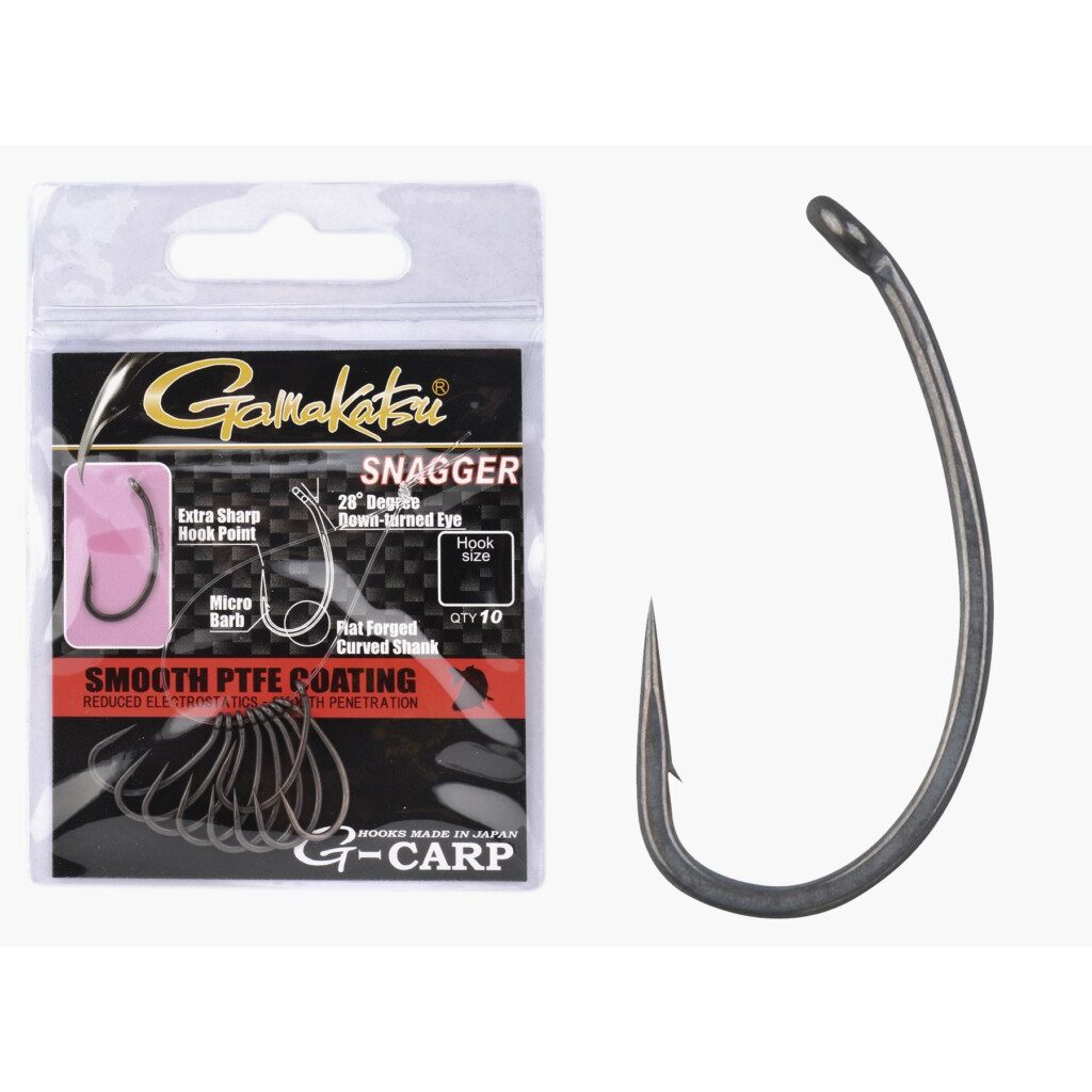 Особенность модели карповых крючков Gamakatsu G-Carp Snagger заключается в особом угле кольца из-за которого смонтированный крючок занимает в воде правильное положение и всегда попадает в нижнюю губу. Таким образом отпадает необходимость в использовании выравнивающих систем. Высокий уровень прочности и надежности достигается из-за особой кованой формы поддева, равномерно распределяющей нагрузки. Крючок Gamakatsu G-Carp Snagger снабжен микробородкой, легко пробивающей губу и так же легко извлекаемой из нее.
