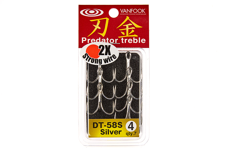 Vanfook DT-58S - морская серия крючков для ловли сибаса, морских окуней и других видов рыб. Тройники этой серии имеют повышенную прочность по сравнению с другими крючками того же класса. Выполнены в стальном цвете. Подходят для оснащения воблеров, блесен и пилькеров.