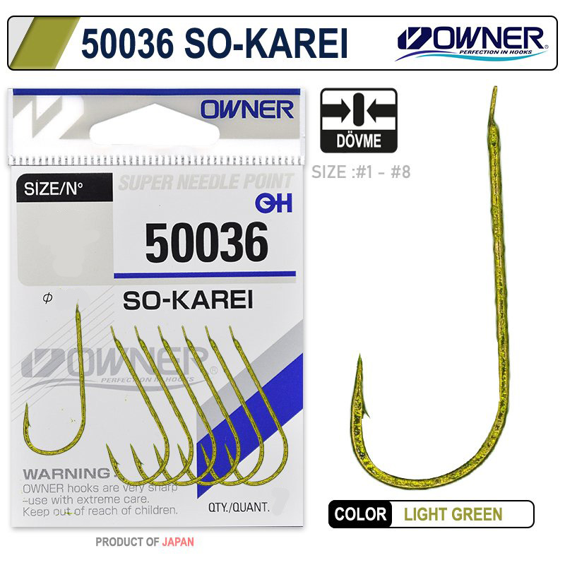 Owner Sokkou Karei light green 50036 – серия длинноцевьевых одинарных крючков с лопаткой, изготовленных из высококачественной углеродистой стали. Owner Sokkou Karei имеют классический круглый загиб, кованый поддев, острейшее жало, стандартную бородку и зеленого цвета покрытие. Замечено, что синий, зеленый и бронзовый цвет крючка практически не настораживают рыбу. Поэтому в период бесклевья для ловли осторожной рыбы поплавочными и донными снастями не лишним будет использовать крючки Owner 50036.