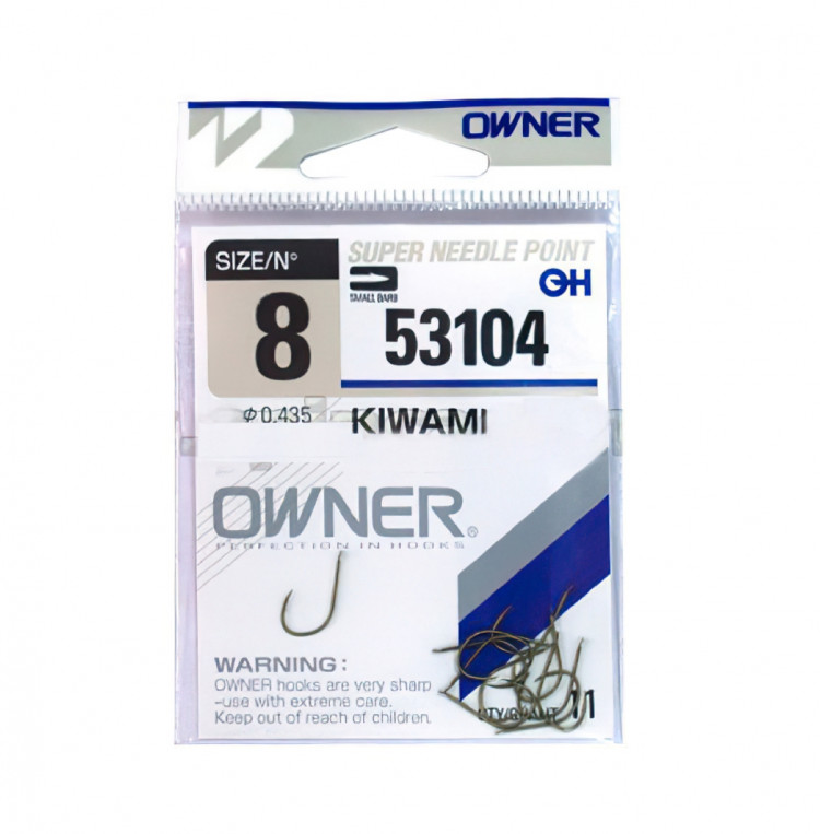 Owner Kiwami 53104 - универсальные крючки для оснащения поплавочных удочек. Более мелкие размеры с успехом можно использовать для самых деликатных насадок (мотыль, ручейник, поденка), крупные – для червя, пучка опарышей, зерен пшеницы, перловки, гороха. Имеют короткое цевье с круглым загибом, аккуратную лопаточку для привязки, не сильно травмирующую рыбу бородку.