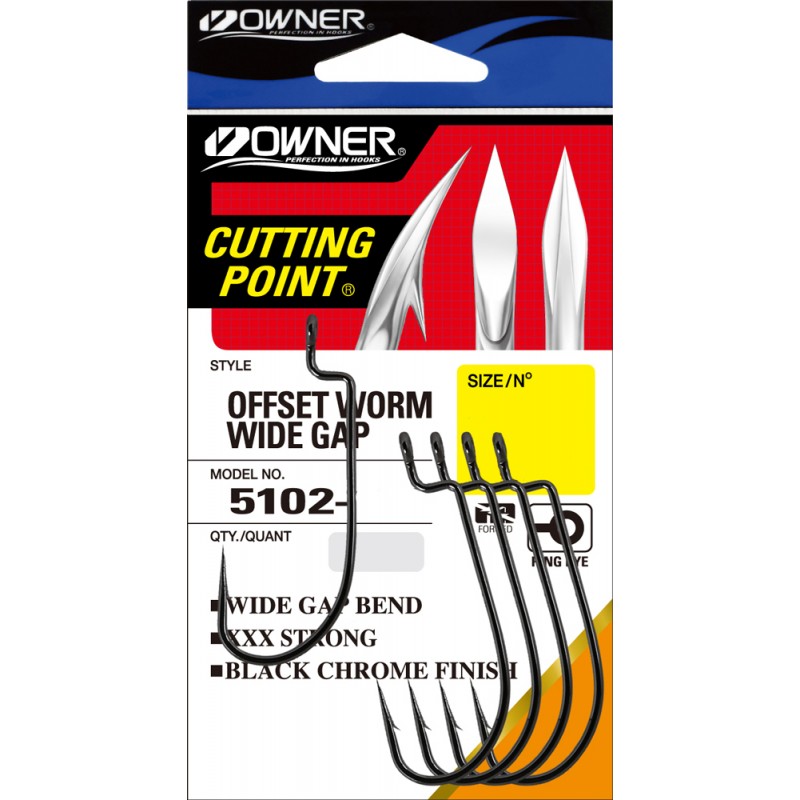 Owner Offset Shank Wide Gap 5102 – классический офсетный крючок с круглым широким загибом, прямым удлиненным цевьем, прямоугольной ступенькой и самым стойким защитным покрытием Black Chrome. Серия Owner 5102 – идеальное решение для оснащения пластиковых червей с толстым телом, крупных твистеров, слагов и других подобных им приманок из мягкого пластика. Острейшее жало Owner Offset Shank Wide Gap с самой совершенной заточкой Cutting Point и нормальной величины бородка гарантируют эффективную подсечку и уверенное удержание подсеченной рыбы.