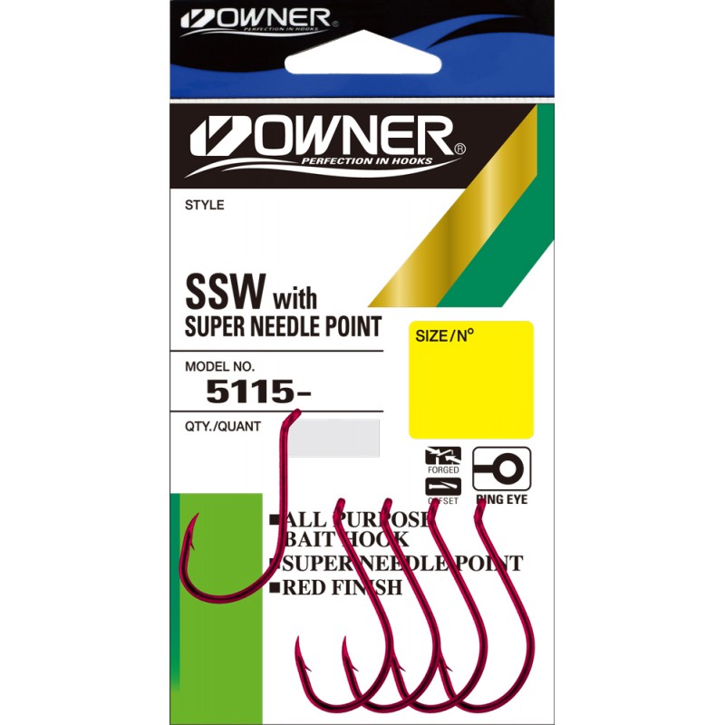 Owner OH SSW 5115 – серия мощных одинарных крючков, изготовленных из высококачественной углеродистой стали. Крючки Owner 5115 имеют широкий загиб, кованый поддев, отогнутое внутрь и в сторону жало, нормальной длины цевье с отогнутым наружу колечком для привязывания лески и защитное покрытие черного цвета. Owner 5115 с успехом используются в оснастках для ловли крупной рыбы. Идеальны для ловли лососевых в реках, морской рыбалки и троллинга с использованием мертвой рыбки. Owner OH SSW используются также для ловли сома, судака, жереха, тарпона и других хищных рыб. Острейшее жало с эксклюзивной заточкой Super Needle Point и нормальной величины бородка гарантируют эффективное засечение и надежное удержание любой клюнувшей рыбы.