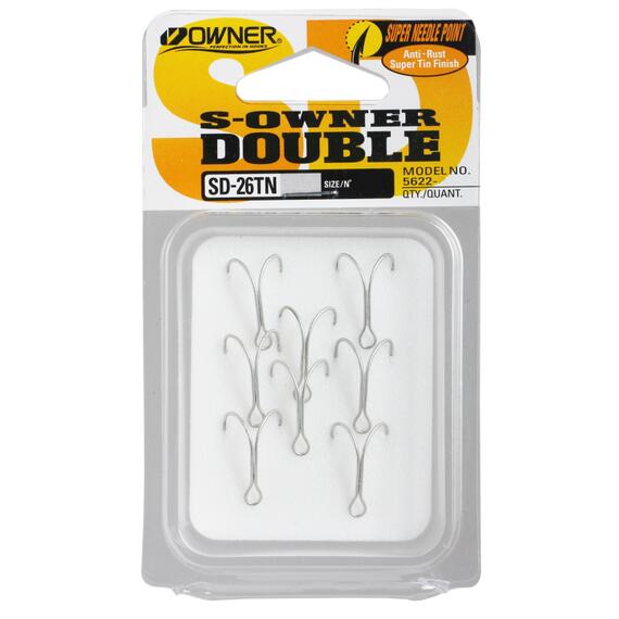 Двойники Owner SD-26TN — серия включает двойники небольших размеров. На их изготовление идет очень тонкая, но прочная проволока. Часто эту серию называют нахлыстовой, т. к. главное направление их применения – изготовление на их основе разнообразных мушек и стримеров. Также им отдают предпочтение жерличники и кружочники, любители ловли живцовой удочкой. В отличие от тройников двойные крючки в меньшей степени травмируют живца, оснастки на их основе монтируются легче, а зацепистость при подсечке клюнувшей рыбы достаточно высокая. Новый виток популярности и востребованности этих крючков совпал с увлечением многих спиннингистов ловлей на джиговые приманки, в том числе и микроджиговые. И здесь двойники по праву заняли свою законную нишу, возглавив рейтинг среди других категорий крючков. На их основе быстро, и главное, легко монтируются практически любые мягкие пластиковые приманки (твистеры, виброхвосты, черви и др.), а также поролоновые и полиуретановые рыбки, приманки на основе елочной мишуры, шерсти и пр.
