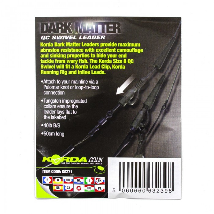 Новые укороченные версии невероятно популярного поводка с вертлюгом Dark Matter ring swivel leader, идеально подходящего для использования с пакетами Korda Solidz PVA и в ситуациях, когда требуется более короткий поводок.