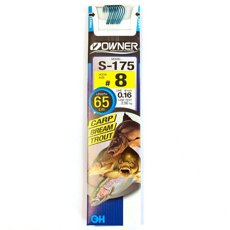 Готовые поводки Owner S-175 представляет собой крючок, оснащенный поводком длиной 65 сантиметров. Крючок имеет тонкое жало и слегка изогнутое цевье. Такая снасть хорошо подойдет для любителей ловли на поплавочные и донные снасти. Зацепистый крючок может использоваться для ловли на самые разнообразные насадки. Крепление одинарника выполнено в виде лопатки. Цвет покрытия – голубой.