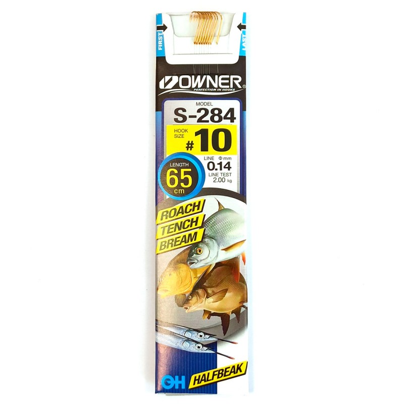 Готовые поводки Owner S-284 созданы для ловли белой рыбы на поплавочные и донные снасти. Они представляют собой сочетание одинарного крючка 50284 от фирмы Owner и нейлоновой лески длиной 65 см. Эта модель имеет крепление в виде лопатки, круглый загиб и небольшую зацепистую бородку. Отсутствие петельки позволяет регулировать ее прямо на месте ловли. Размеры крючков Owner 50284 внутри серии изменяются от 16 до 6 номера по международной классификации. Соответственно размеру крючка изменяется и диаметр поводка (от 0.09 до 0.18 мм). И если самые маленькие крючки на тонкой леске предназначены для ловли мелкой рыбы, то крупные крючки с прочной леской легко справятся и с трофейными экземплярами. Крючки этой серии имеют стойкое золотое покрытие.