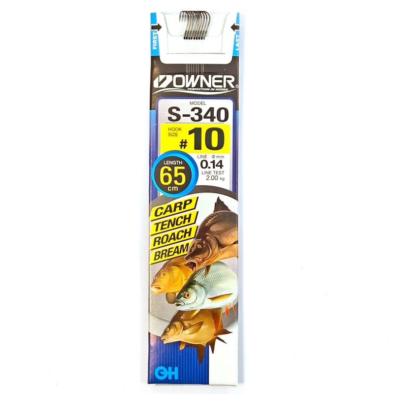 Серия поводков Owner S-340 предназначена для ловли белой рыбы поплавочными и донными снастями. Длина поводка составляет 65 см, отсутствие петельки позволяет регулировать ее прямо на месте ловли. Размеры крючков Owner 50340 Chinta внутри серии изменяются от 14 до 4 номера по международной классификации. Соответственно размеру крючка изменяется и диаметр поводка (от 0.12 до 0.18 мм). И если самые маленькие крючки на тонкой леске предназначены для ловли мелкой рыбы, то крупные крючки с прочной леской легко справятся и с трофейными экземплярами. Крючки этой серии имеют стойкое покрытие.