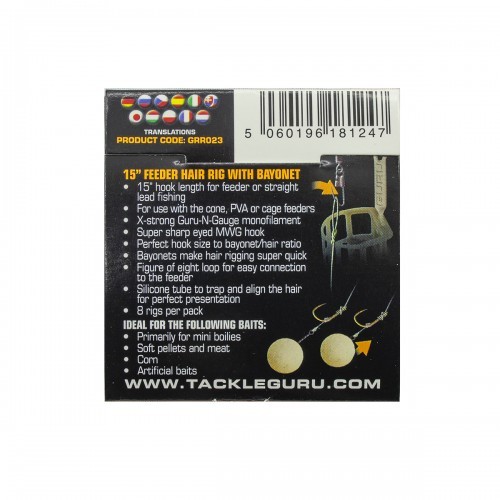 Готовые поводки просто незаменимы в случаях, когда у Вас недостаточно времени для полноценной подготовки к рыбалке или же не хватает опыта для создания по-настоящему надежной оснастки. Guru Bayonets 15" предназначены для быстрого крепления крупных и твердых насадок типа бойлов или искусственных приманок. На конце волоса крепится винт-сверло, которое легко входит в приманку и надежно закрепляет ее на оснастке. В упаковке вы найдете 8 готовых фидерных поводков длинною 38 см. Каждый поводок связан по высочайшим стандартам из монофильного поводочного материала Guru N-Gauge. В качестве крючка был выбран супер надежный Guru MWG.