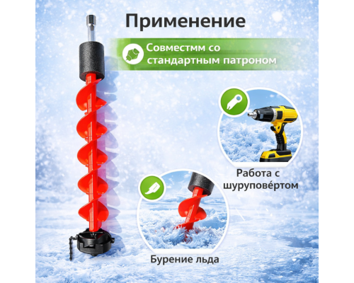 Диаметр 130 мм обеспечивает универсальные параметры бурения, позволяя легко делать лунки под стандартные рыболовные установки и приспособления. Шнек оснащён адаптером для установки в шуруповерт или аккумуляторную дрель с шестигранным хвостовиком, что обеспечивает надёжное соединение и стабильное вращение.