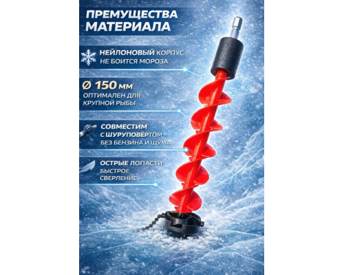 Конструкция шнека рассчитана на долговременную эксплуатацию в условиях сильных морозов, а лёгкий пластик снижает общий вес комплекта и облегчает переноску на рыбалку.