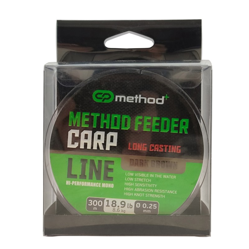 Леска CP Method+ Method Feeder Carp Line – монофильная леска нового поколения, изготовленная с использованием передовых технологий из высококачественных современных полимеров. Разработана специально для применения в метод-фидерной ловле в качестве основной лески. Отличается исключительно гладкой поверхностью, достаточной жёсткостью и минимальной растяжимостью, что обеспечивает выполнение дальних точных забросов и высокую чувствительность фидерной снасти. К достоинствам CP Method+ Method Feeder Carp Line также можно отнести незаметность для рыбы, повышенную устойчивость к абразивным воздействиям, высокую прочность, в том числе и на узлах, минимальный коэффициент памяти. Специальная окраска Dark Brown отлично маскирует её на фоне дна водоёма. Метод-фидерные лески CP Method+ Method Feeder Carp Line выпускается в наиболее востребованных диаметрах, в размотках 150 и 300 м.