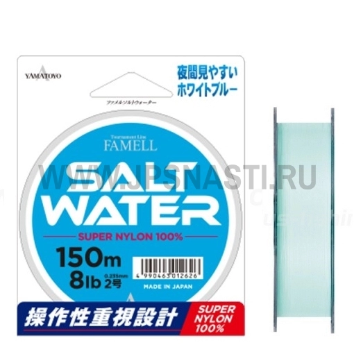 Yamatoyo Famell Salt Water - монолеска (нейлон) самого высокого класса с повышенной прочностью на узлах. Леска хорошо видна в отраженном свете, что делает ее идеальной для ночных рыбалок. Данный товар разрабатывался специально для морской ловли, что подразумевает под этим повышенные требования к прочности и стойкости к истиранию.