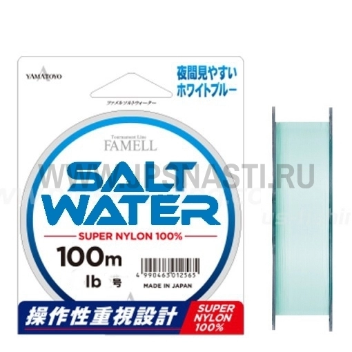 Yamatoyo Famell Salt Water - монолеска (нейлон) самого высокого класса с повышенной прочностью на узлах. Леска хорошо видна в отраженном свете, что делает ее идеальной для ночных рыбалок. Данный товар разрабатывался специально для морской ловли, что подразумевает под этим повышенные требования к прочности и стойкости к истиранию.