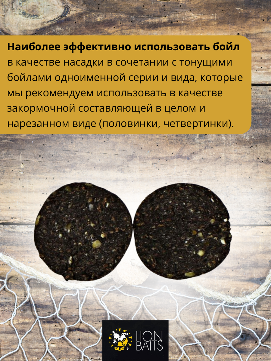 Наиболее эффективно использовать бойл в качестве насадки в сочетании с тонущими бойлами одноименной серии и вида, которые мы рекомендуем использовать в качестве закормочной составляющей в целом и нарезанном виде (половинки, четвертинки).