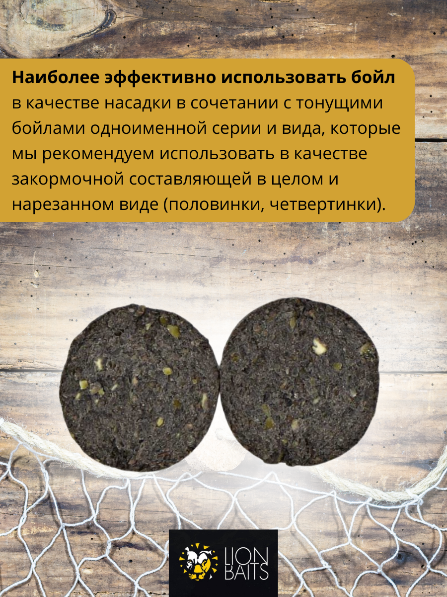 Наиболее эффективно использовать бойл в качестве насадки в сочетании с тонущими бойлами одноименной серии и вида, которые мы рекомендуем использовать в качестве закормочной составляющей в целом и нарезанном виде (половинки, четвертинки).