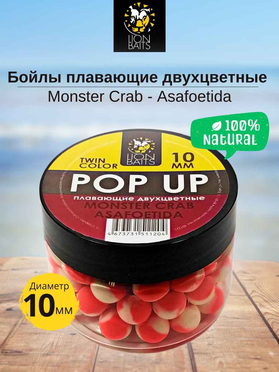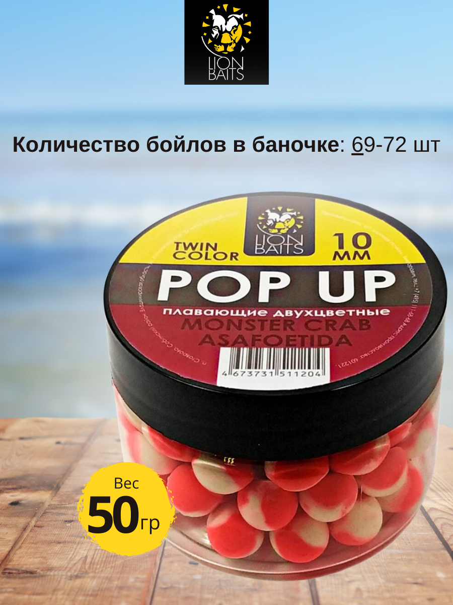 Lion Baits Бойлы плавающие двухцветные (Pop-Up) Twin Color "Monster crab - Asafoetida" 10 мм