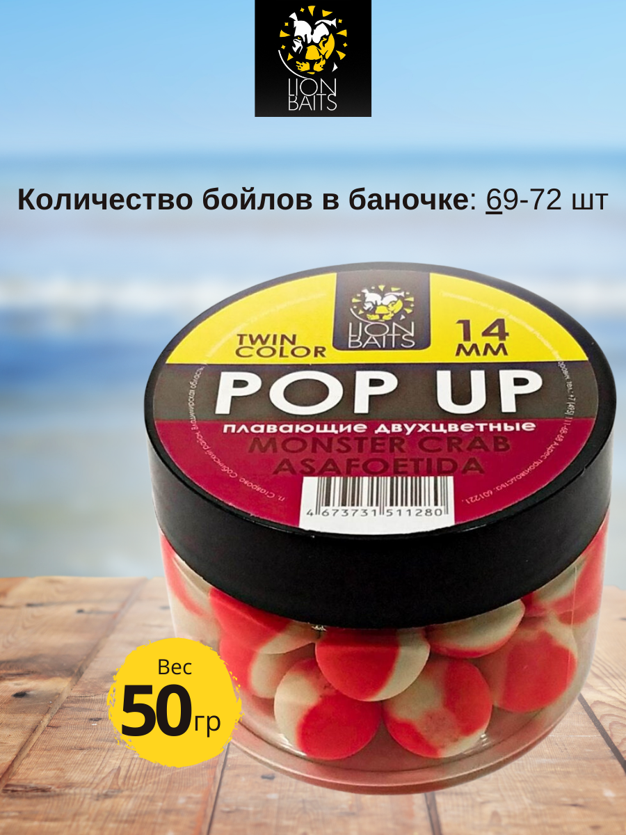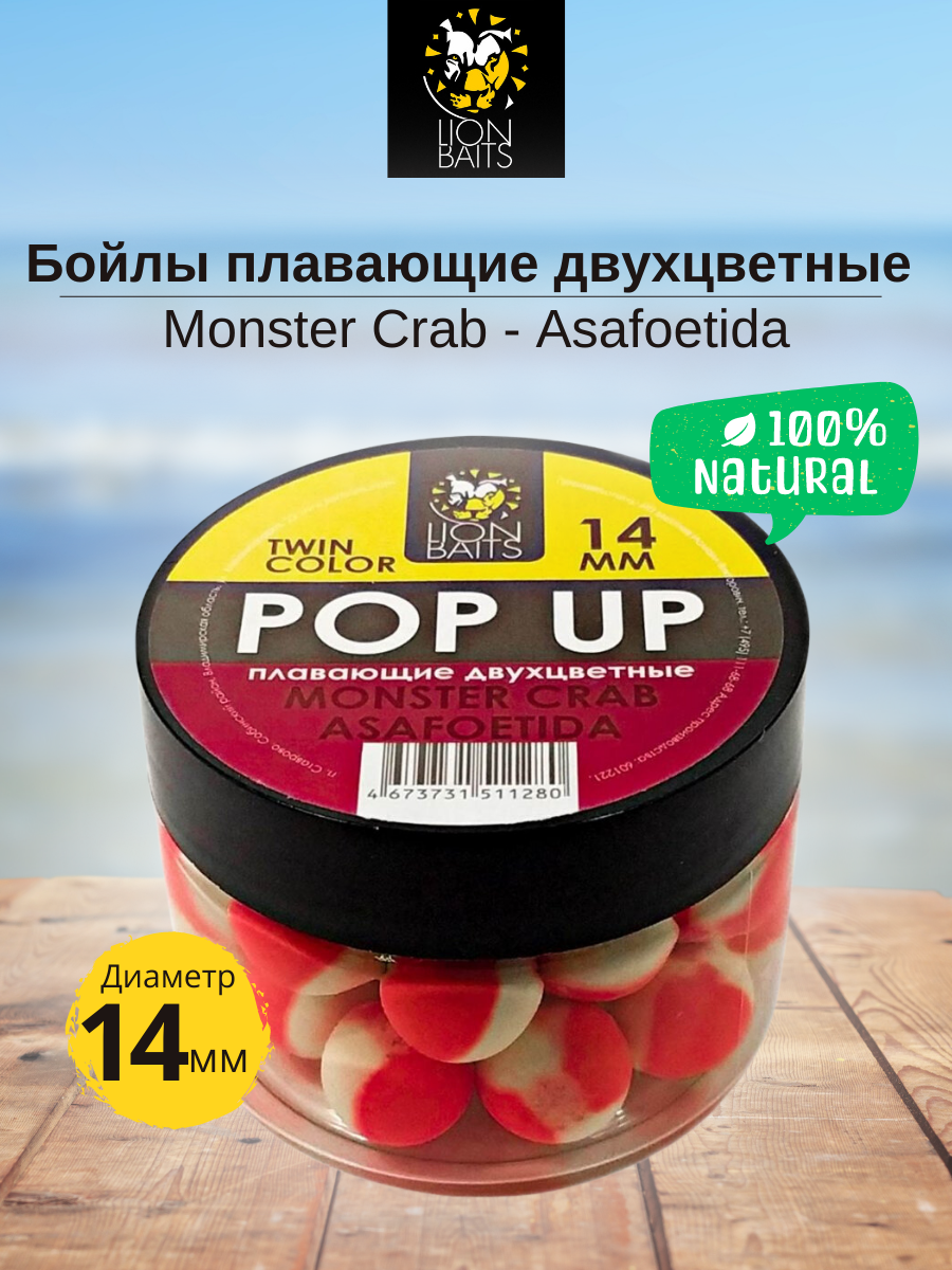Lion Baits Бойлы плавающие двухцветные (Pop-Up) Twin Color "Monster crab - Asafoetida" 14 мм