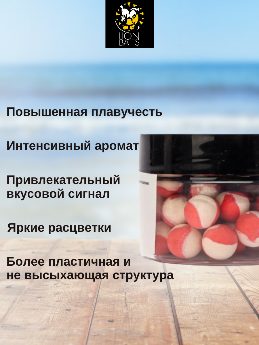 Новейшая разработка от компании Lion Baits - серия двухцветных плавающих бойлов Pop-up «Twin Color» повышенной плавучести с комбинированными ароматами, которые всегда остаются свежими и мягкими, даже пролежав продолжительное время на открытом воздухе. Этого удалось добиться благодаря нашим технологам, разработавшим уникальный микс.