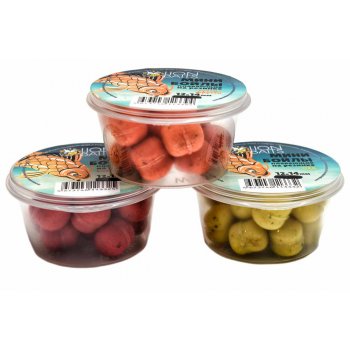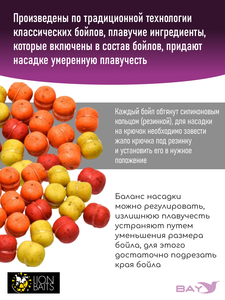 Бойлы имеют яркий цвет и ярко выраженный аромо вкус, который привлекает внимание рыбы и делает насадку хорошо различимой в воде. Произведены по традиционной технологии классических бойлов, плавучие ингредиенты, которые включены в состав бойлов, придают насадке умеренную плавучесть. При подборе соответствующего размера крючка, насадка с резинкой приобретает сбалансированное состояние в воде (нейтральную плавучесть), что способствует быстрой засечке. Баланс насадки можно регулировать, излишнюю плавучесть устраняют путем уменьшения размера бойла, для этого достаточно подрезать края бойла. Каждый бойл обтянут силиконовым кольцом (резинкой), для насадки на крючок необходимо завести жало крючка под резинку и установить его в нужное положение.