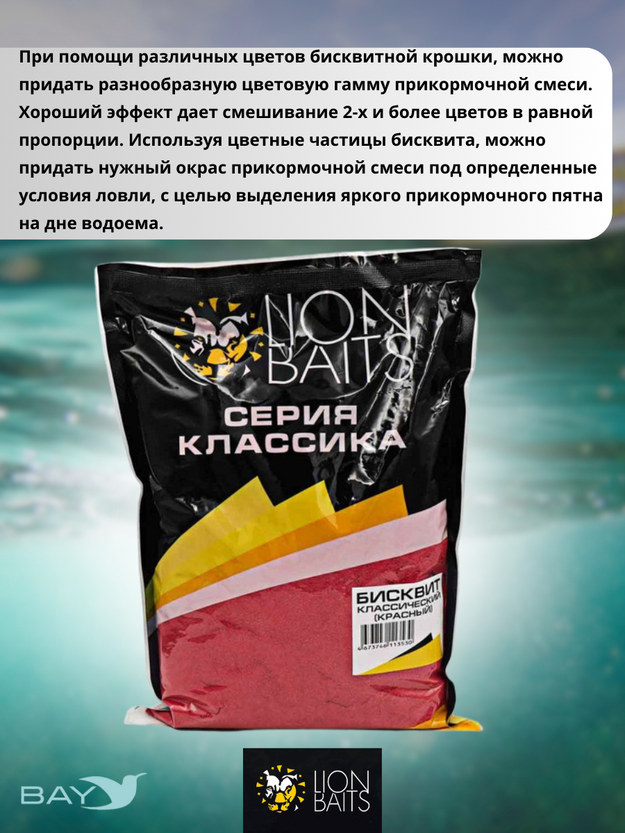 При помощи различных цветов бисквитной крошки, можно придать разнообразную цветовую гамму прикормочной смеси. Хороший эффект дает смешивание 2-х и более цветов в равной пропорции. Используя цветные частицы бисквита, можно придать нужный окрас прикормочной смеси под определенные условия ловли, с целью выделения яркого прикормочного пятна на дне водоема.