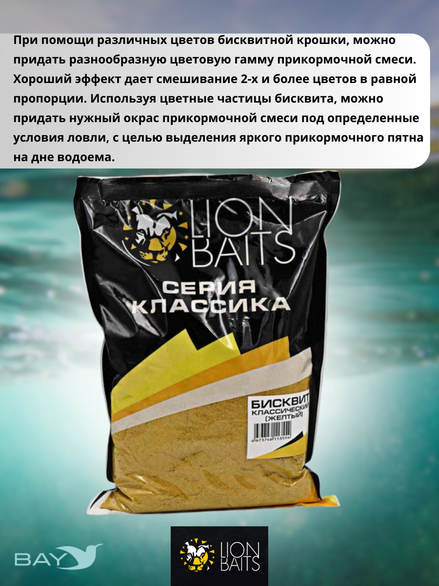 При помощи различных цветов бисквитной крошки, можно придать разнообразную цветовую гамму прикормочной смеси. Хороший эффект дает смешивание 2-х и более цветов в равной пропорции. Используя цветные частицы бисквита, можно придать нужный окрас прикормочной смеси под определенные условия ловли, с целью выделения яркого прикормочного пятна на дне водоема.