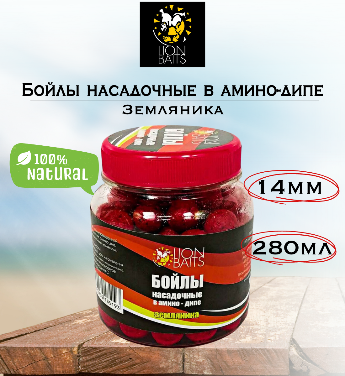 Lion Baits Бойлы насадочные в амино-дипе "Земляника" 14мм 280мл