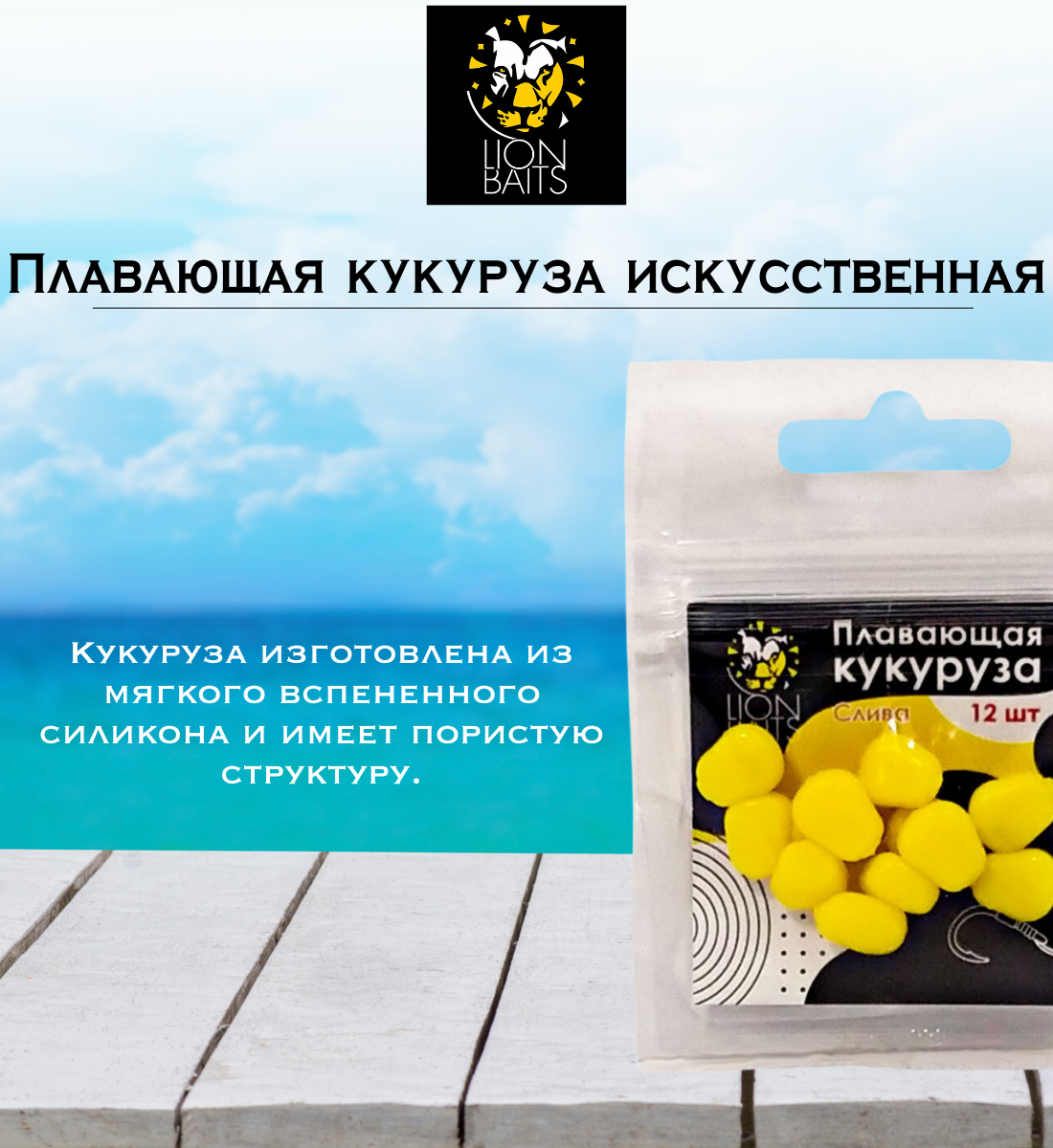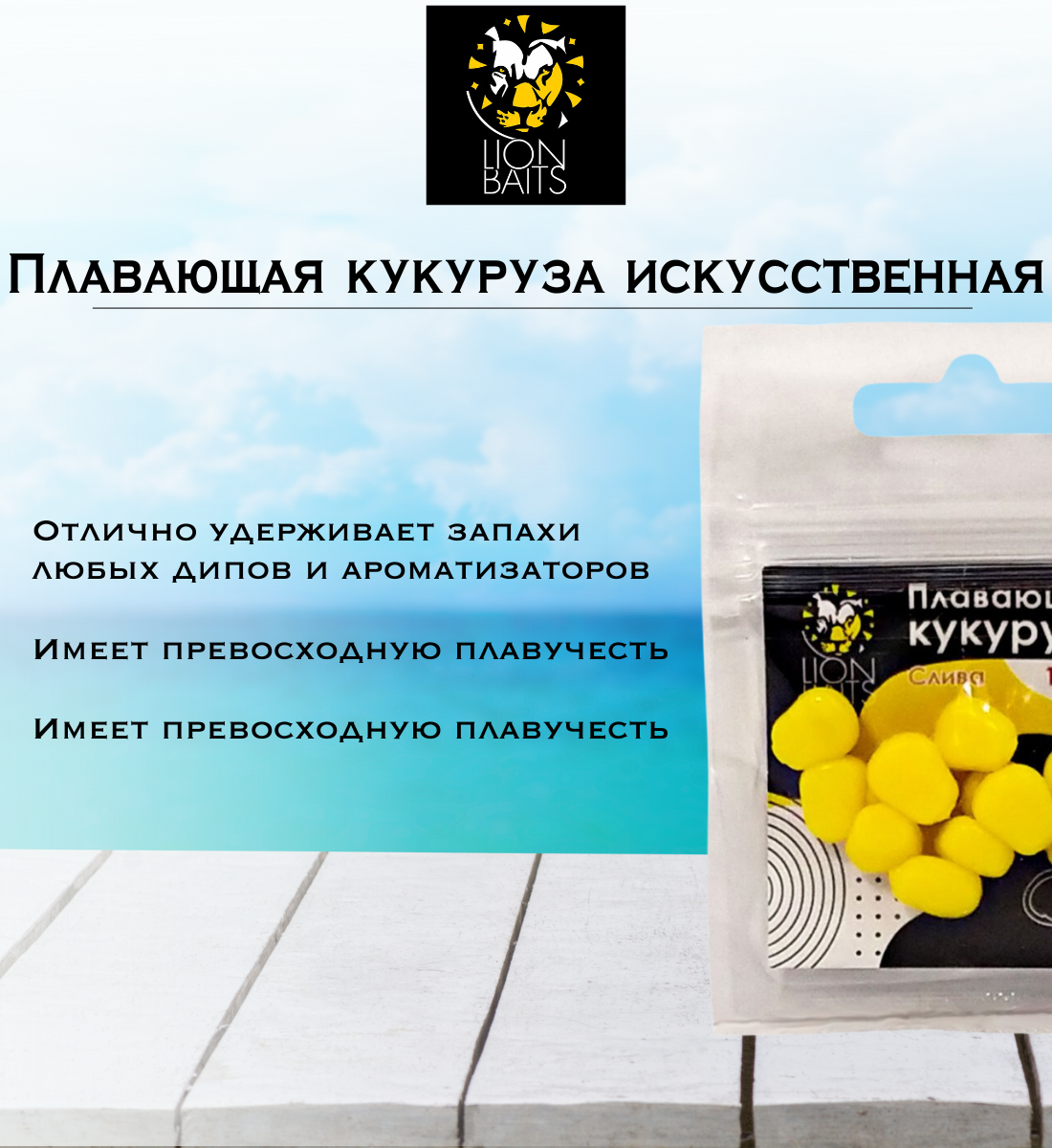 Плавающая силиконовая ароматизированная кукуруза от компании Lion Baits - это линейка искусственной кукурузы повышенной плавучести с топовыми классическими ароматами сливы, ананаса и клубники.
