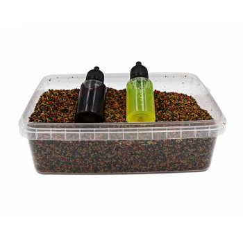 Метод микс 3 в 1 – это специализированная смесь пеллетса, диаметром 1,5-2 мм одного вкуса с разной цветовой гаммой (красный, жёлтый, коричневый, зеленый и прочее), которая обладает натуральным арома-вкусом рыбных гранул. Гранулы обладают определенными физическими свойствами, которые позволяют сделать плотную набивку в кормушки с последующей равномерной работой (распада) смеси в воде.