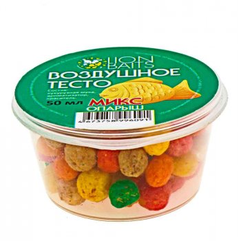 Воздушное тесто (цветной микс) – это плавающая насадка в виде шариков из кукурузного теста правильной формы, размером 5-7 мм с пористой и мягкой структурой. Плавающая насадка легко нанизывается на крючок и от 20 до 40 минут удерживается на нем, соблазняя на поклевку карасей, карпов, лещей, язей и других рыб. Насаживать шарики воздушного теста можно двумя способами: