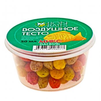 Воздушное тесто (цветной микс) – это плавающая насадка в виде шариков из кукурузного теста правильной формы, размером 5-7 мм с пористой и мягкой структурой. Плавающая насадка легко нанизывается на крючок и от 20 до 40 минут удерживается на нем, соблазняя на поклевку карасей, карпов, лещей, язей и других рыб. Насаживать шарики воздушного теста можно двумя способами: