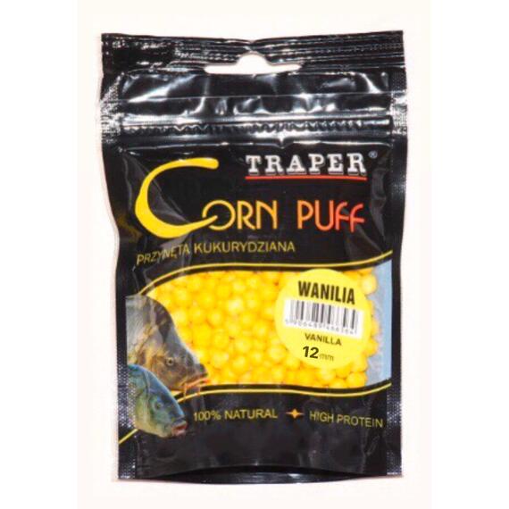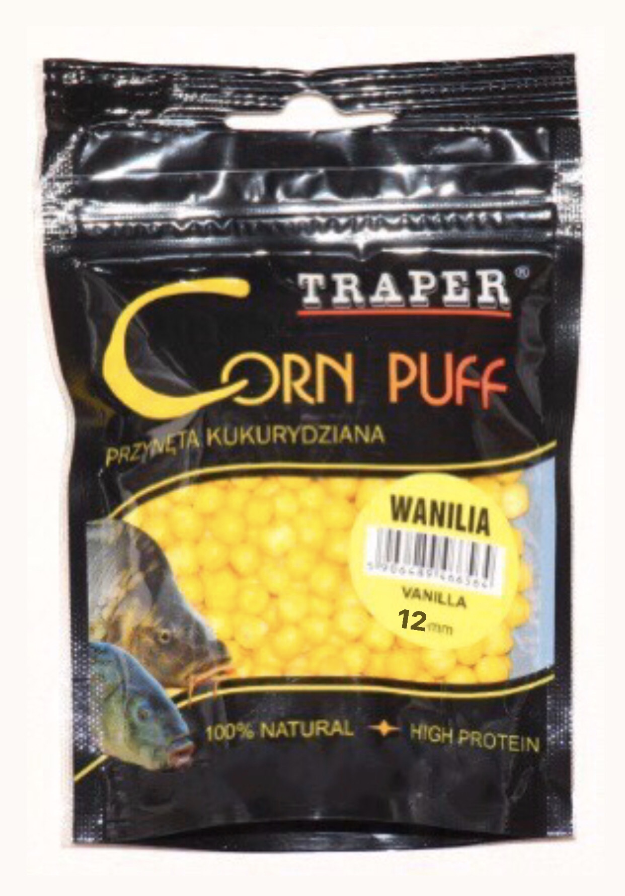 Corn puff - превосходная насадка, работающая по принципу шариков пенопласта. Содержит ароматизаторы, привлекающие рыбу. Может использоваться для ловли карпа, карася, голавля, язя, амура и другой рыбы. После попадания в воду размокает спустя 15 минут, поэтому подходит только для активной ловли (с частыми перезабросами кормушки). Вулканизированная кукуруза расфасована в удобные пакетики на защёлке. Разработана технология, позволяющая изготавливать вулканизированную кукурузу разных диаметров: 4 мм, 8 мм и 12 мм.
