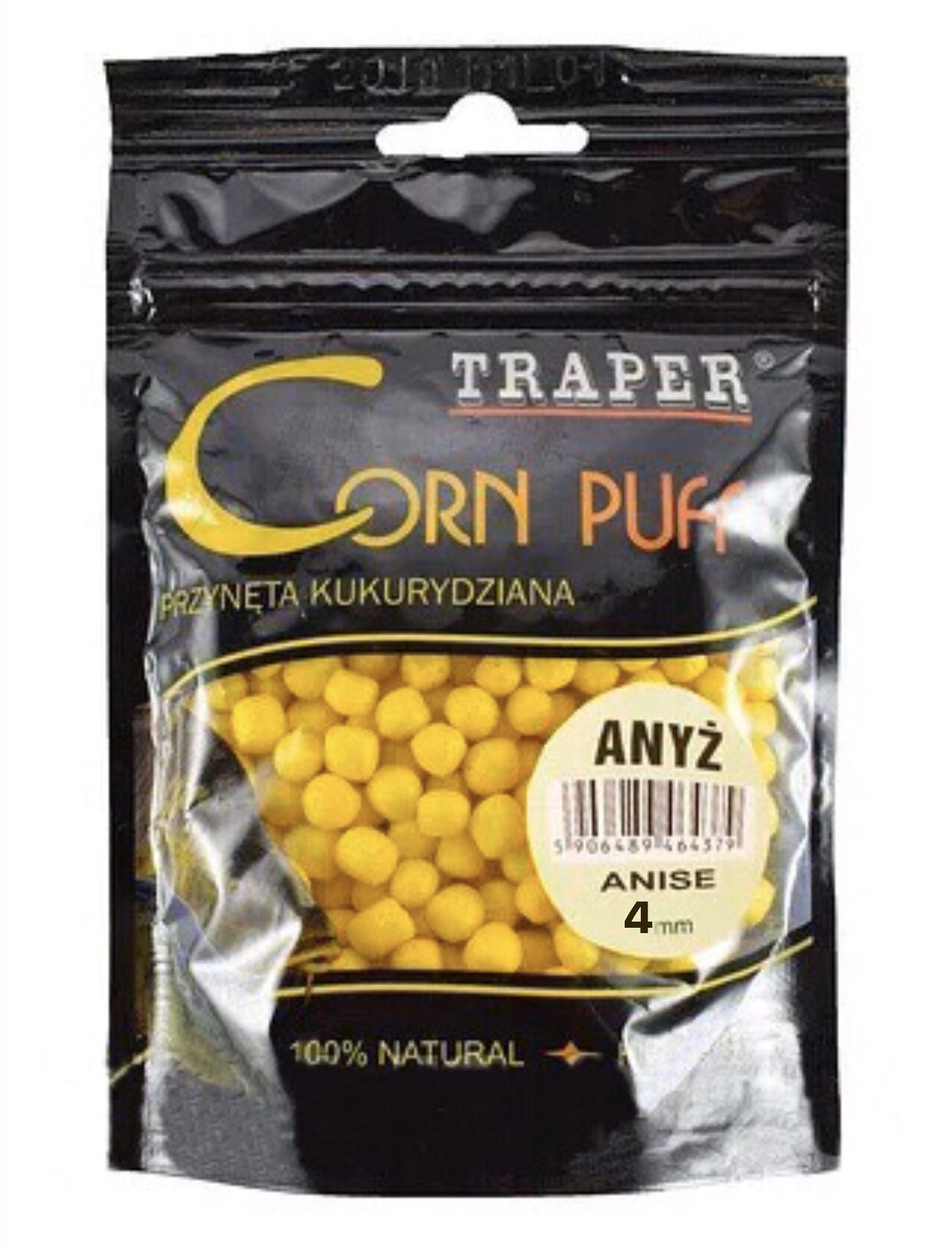 Corn puff - превосходная насадка, работающая по принципу шариков пенопласта. Содержит ароматизаторы, привлекающие рыбу. Может использоваться для ловли карпа, карася, голавля, язя, амура и другой рыбы. После попадания в воду размокает спустя 15 минут, поэтому подходит только для активной ловли (с частыми перезабросами кормушки). Вулканизированная кукуруза расфасована в удобные пакетики на защёлке. Разработана технология, позволяющая изготавливать вулканизированную кукурузу разных диаметров: 4 мм, 8 мм и 12 мм.