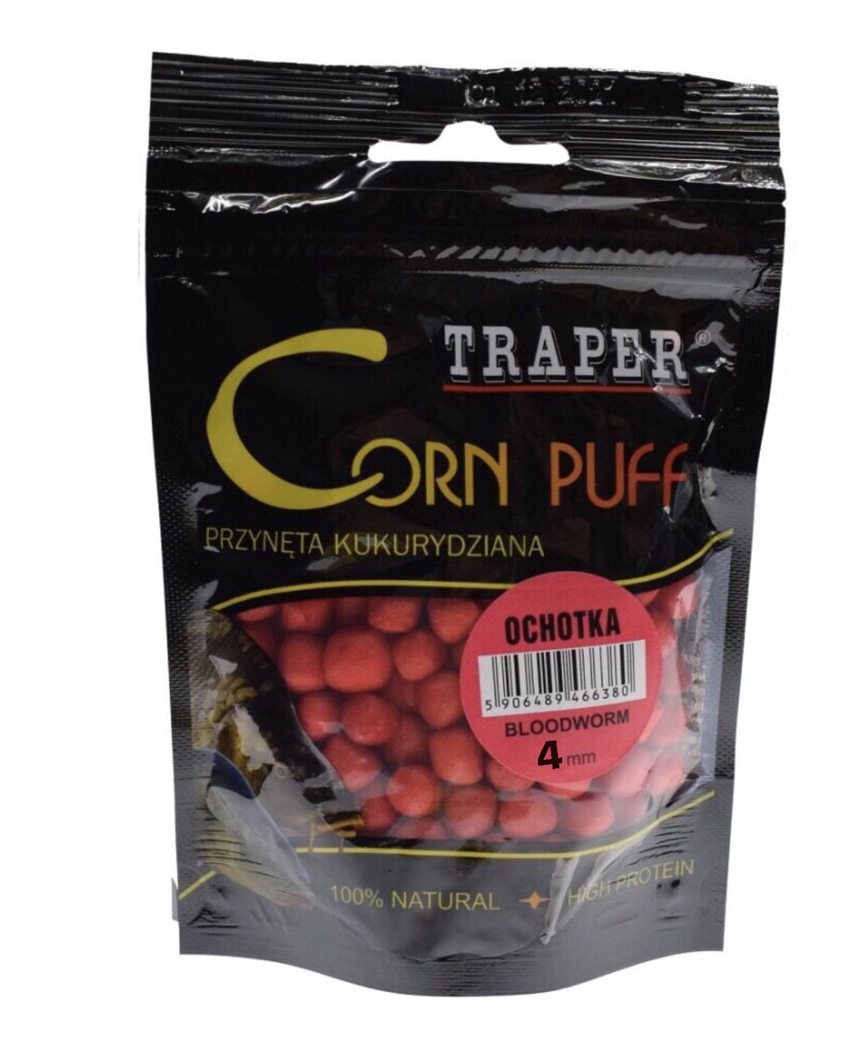 Corn puff - превосходная насадка, работающая по принципу шариков пенопласта. Содержит ароматизаторы, привлекающие рыбу. Может использоваться для ловли карпа, карася, голавля, язя, амура и другой рыбы. После попадания в воду размокает спустя 15 минут, поэтому подходит только для активной ловли (с частыми перезабросами кормушки). Вулканизированная кукуруза расфасована в удобные пакетики на защёлке. Разработана технология, позволяющая изготавливать вулканизированную кукурузу разных диаметров: 4 мм, 8 мм и 12 мм.