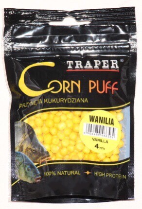 Corn puff - превосходная насадка, работающая по принципу шариков пенопласта. Содержит ароматизаторы, привлекающие рыбу. Может использоваться для ловли карпа, карася, голавля, язя, амура и другой рыбы. После попадания в воду размокает спустя 15 минут, поэтому подходит только для активной ловли (с частыми перезабросами кормушки). Вулканизированная кукуруза расфасована в удобные пакетики на защёлке. Разработана технология, позволяющая изготавливать вулканизированную кукурузу разных диаметров: 4 мм, 8 мм и 12 мм.