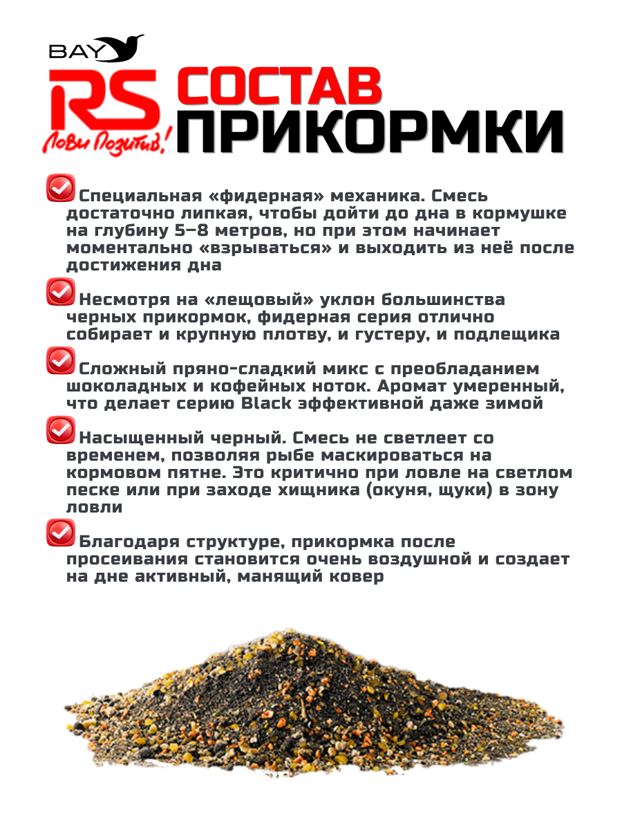 RS Black Series - это новая серия рыболовных прикормок темного цвета. Серия разработана специально для сложных условий и позволяет приманить на точку даже самую осторожную рыбу. Богатый и разнообразный состав, а также понятная механика работы этой прикормки позволят применять её абсолютно в любых условиях наших водоемов.